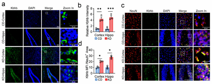 生酮饮食是增加体内β-羟基丁酰化底物BHB的有效方式。研究人员对APP/PS1小鼠进行了为期三个月的生酮饮食,结果显示生酮饮食显著诱导了神经元中β-羟基丁酰化修饰水平的增加。