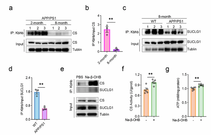 图2. CS和SUCLG1的β-羟基丁酰化修饰降低与APP/PS1小鼠疾病发生发展相关