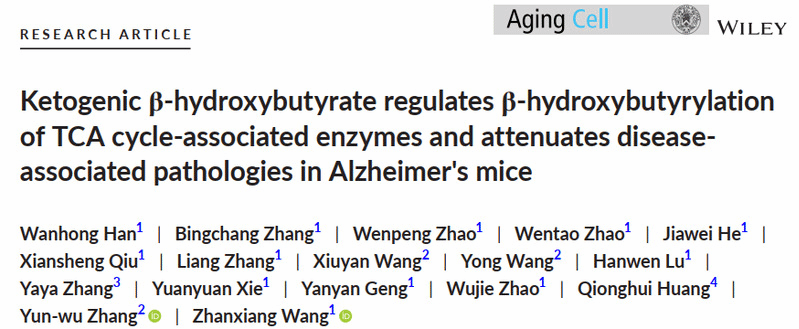 2024年10月16日,厦门大学神经科学研究所的张云武教授团队与附属第一医院的王占祥教授团队合作在《Aging Cell》(IF:8.0/Q1 TOP)在线发表了题为“Ketogenic β-hydroxybutyrate regulates β-hydroxybutyrylation of TCA cycle-associateed enzymes and attenuates disease-associated pathologies in Alzheimer’s mice”的论文,阐述了生酮饮食如何通过β-羟基丁酰化这一新型蛋白质翻译后修饰,调节神经元的能量代谢,从而改善APP/PS1小鼠病理表型的分子机制。