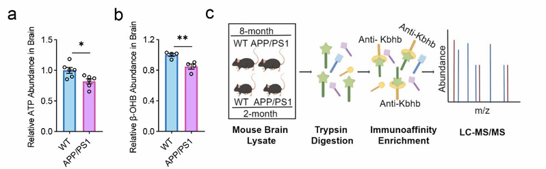 总之,在该研究中,团队研究人员使用APP/PS1小鼠,借助蛋白质β-羟基丁酰化蛋白质组学技术,鉴定出CS和SUCLG1的β-羟基丁酰化失调是AD小鼠脑组织ATP缺乏的重要因素。生酮饮食通过上调APP/PS1小鼠神经元中CS和SUCLG1的β-羟基丁酰化,促进三羧酸循环及ATP生成,从而缓解AD的病理表型。这项研究为生酮饮食对AD的潜在治疗功能提供了新的分子机制。