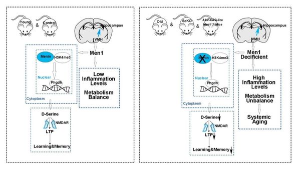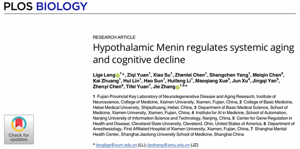 2023年3月17日,厦门大学神经科学研究所张杰教授团队在Plos Biology杂志上发表题为“Hypothalamic Menin regulates systemic aging and cognitive decline”的研究论文。文中发现,下丘脑的Menin蛋白表达随衰老进程而逐渐下降,影响了机体的代谢稳态和D-丝氨酸的合成,进而导致衰老进程的加速和认知功能障碍。研究还发现在下丘脑回补Menin蛋白或在饮食中添加D-丝氨酸可以显著改善年老小鼠的衰老表型和认知障碍。
