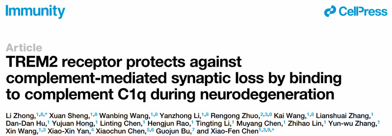 2023年7月12日,厦门大学神经科学研究所陈小芬教授和钟力副教授团队在Immunity上在线发表题为TREM2 receptor protects against complement-mediated synaptic loss by binding to complement C1q during neurodegeneration的研究论文。