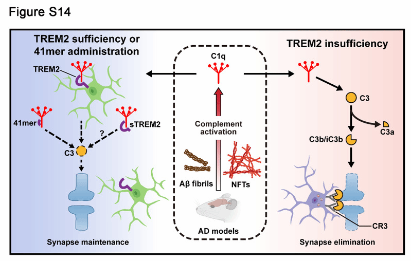 图1. TREM2通过高亲和力地结合补体起始因子C1q从而抑制AD大脑中过度激活的补体通路,减少补体介导的小胶质细胞对突触的吞噬和消除,最终在AD病理环境中参与神经突触稳态的维持。当TREM2蛋白水平不足时,补体通路的过度激活促进小胶质细胞对突触的异常吞噬,从而导致突触的大量丢失。通过补充TREM2多肽(41mer)可抑制补体激活并修复突触稳态。