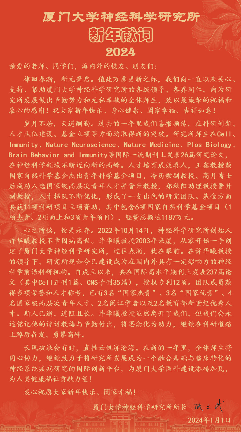 律回春渐,新元肇启。值此万象更新之际,我们向一直以来关心、支持、帮助厦门大学神经科学研究所的各级领导、各界同仁,向为研究所发展做出辛勤努力和无私奉献的全体师生,致以最诚挚的祝福和衷心的感谢!祝大家新年快乐、身心健康、阖家幸福、吉祥如意!