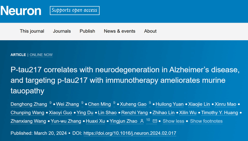 2024年3月20日,厦门大学神经科学研究所赵颖俊教授团队与空军军医大学唐都医院神经内科张巍副教授团队以及澳门大学明晨助理教授合作在神经科学顶级期刊Neuron杂志上发表了题为“P-tau217 correlates with neurodegeneration in Alzheimer's disease, and targeting p-tau217 with immunotherapy ameliorates murine tauopathy”的研究论文。他们研发出了一种特异性靶向p-tau217的单克隆抗体(mAb2A7),通过该抗体检测了AD患者脑脊液中的p-tau217水平并发现其与AD的神经退变高度相关。重要的是,使用mAb2A7治疗tau转基因小鼠(PS19)减轻tau病理并抑制其神经元死亡和脑萎缩等神经退变表型,恢复了小鼠大脑蛋白稳态。此外,他们发现总tau靶向免疫治疗虽也能抑制神经退变,但引发了严重的运动障碍,而 mAb2A7治疗不损伤小鼠的运动功能。该研究揭示p-tau217在tau病理发生和神经变性中发挥关键作用,并开发了一种有效且副作用较低的潜在AD免疫治疗策略。