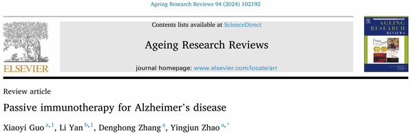 [1] Guo X, Yan L, Zhang D, Zhao Y. Passive immunotherapy for Alzheimer's disease. Ageing Res Rev. 2024;94:102192. DOI:10.1016/j.arr.2024.102192