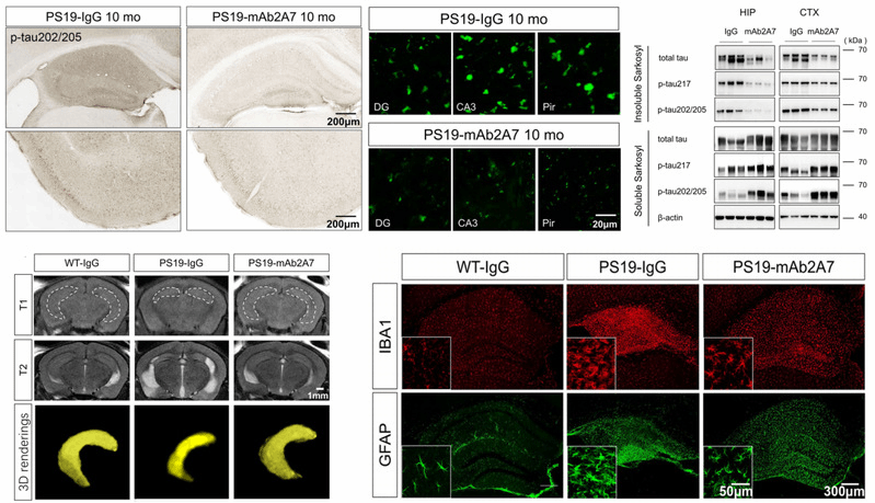 接下来研究人员通过鼻腔给药的方式将mAb2A7递送到PS19小鼠脑内,发现相较于对照组,mAb2A7治疗组小鼠脑内的p-tau沉积和tau聚集物均明显减少,而可溶性总tau水平没有显著变化。进一步分析显示mAb2A7治疗抑制了PS19小鼠的海马萎缩、神经元凋亡、神经元丢失以及神经炎症,并逆转了PS19小鼠的认知障碍,改善了其运动功能。定量蛋白质组学分析显示mAb2A7治疗恢复了PS19小鼠大脑的蛋白稳态。这些发现证明靶向p-tau217的被动免疫治疗能抑制tau病理及相关的神经退行性病变。