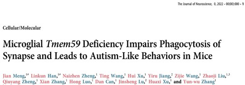 近日,厦门大学医学院神经科学研究所张云武教授团队在神经生物学经典杂志Journal of Neuroscience (美国神经学会会刊)上发表了题为Microglial Tmem59 Deficiency Impairs Phagocytosis of Synapse and Leads to Autism-Like Behaviors in Mice 的文章,探究了TMEM59蛋白在小胶质细胞中缺失对于自闭症的作用及其相关机制。