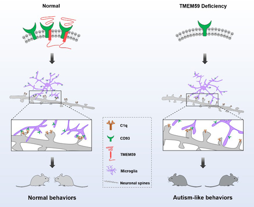 TMEM59是一个自噬相关蛋白。张云武教授团队长期致力于研究TMEM59的生理功能及其在神经系统疾病中的病理作用,先后发现TMEM59可以介导TREM2对于小胶质细胞功能活性的调节(Liu et al., Cell Death and Disease, 2020, 11:678),以及TMEM59的杂合缺失能够改善AD模型小鼠的学习记忆损害和突触功能障碍(Meng et al., Frontiers in Cell & Developmental Biology, 2020, 8:596030)。在本研究中,作者通过对数据库分析发现TMEM59在ASD患者中的表达降低。为了探究TMEM59在ASD中的作用机制,作者构建了在小胶质细胞特异性敲除和全身敲除Tmem59的小鼠,发现这两种小鼠都表现出类似ASD的社交行为缺陷和重复刻板行为。小胶质细胞中缺失TMEM59的小鼠还表现出兴奋性突触传递增强、树突棘密度升高和突触小体中兴奋性突触蛋白水平增多现象,且缺失TMEM59的小胶质细胞对突触的吞噬能力受损。进一步,作者发现TMEM59可以与补体C1q的受体CD93相互作用,TMEM59缺失促进了小胶质细胞中CD93的降解,而小胶质细胞中下调CD93同样损害了对突触的吞噬能力,表明TMEM59缺失可能通过促进CD93的降解,进而引起突触传递异常和ASD发生。该研究为小胶质细胞功能异常在ASD发生发展中的作用提供了新的分子机制。