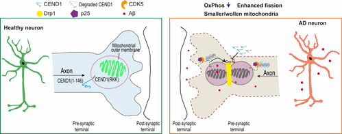 CEND1(Cell cycle exit and differentiation 1)在神经元发育及细胞周期调控中具有重要的作用。张杰教授团队长期从事神经退行性疾病过程中神经元细胞周期的异常激活调控机制。该项研究发现CEND1在神经元的突触前的线粒体的外膜特异定位(如下图),并在AD致病过程显著降低。CEND1不仅调控了线粒体的融合分裂,同时由于其特异的突触前定位的特点,对突触功能的维持也具有重要的作用,这为深入理解线粒体在调控突触功能和神经退行性病变中的机制提供了新的思路。