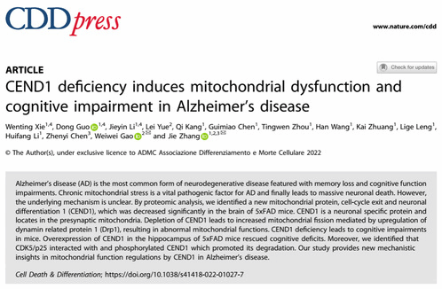 6月22日,厦门大学神经科学研究所张杰教授团队在Nature旗下期刊Cell Death & Differentiation (IF:15.8)杂志上发表题为“CEND1 deficiency induces mitochondrial dysfunction and cognitive impairment in Alzheimer’s disease”的研究论文。该研究鉴定出了一个新的线粒体蛋白CEND1,并阐明了CEND1调控线粒体融合分裂导致AD发生发展的机制,为AD的防治提供了新靶点。