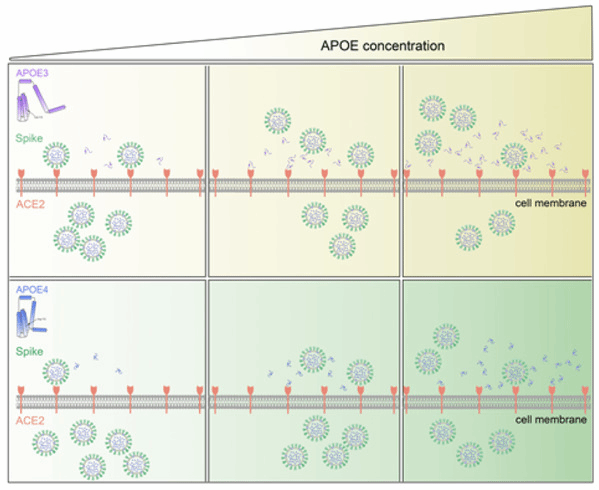 APOE ε4等位基因是阿尔茨海默病(AD)和心血管疾病的主要遗传风险因素。我国正常人群中约有20%携带APOE ε4等位基因。研究表明携带两个拷贝APOE ε4的人患AD的风险比携带两个拷贝APOE ε3的人高15倍(超过90%的可能性会得AD),携带一个拷贝APOE ε4的人患AD风险提高4倍。最近的流行病学分析表明APOE ε4基因型的人群SARS-CoV-2的感染率和重症率显著增加。但是APOE及APOE ε4基因如何影响SARS-CoV-2感染的分子机制仍不清楚。