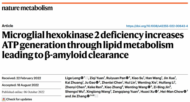 2022年10月6日,厦门大学医学院神经科学研究所张杰教授团队在Nature旗下期刊Nature Metabolism杂志上发表题为“Microglial hexokinase 2 deficiency increases ATP generation through lipid metabolism leading to β-amyloid clearance”的研究成果。揭示己糖激酶2(HK2)调控糖-脂代谢转变对小胶质细胞ATP供能、吞噬、炎症的影响及机制。发现肿瘤临床用药:HK2抑制剂氯尼达明可以显著提高小胶质细胞ATP产生和清除淀粉样蛋白沉积,并改善AD小鼠认知功能障碍的作用,为AD的防治提供了新的策略。