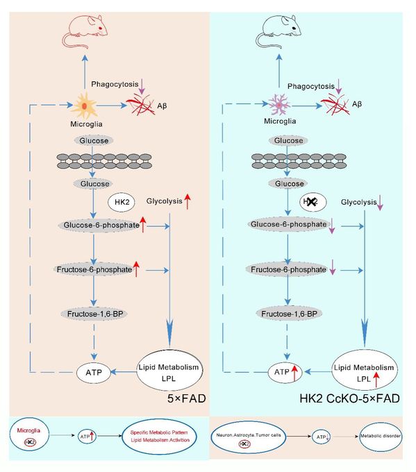 糖代谢通路中负责细胞内葡萄糖代谢的第一个关键酶是己糖激酶(Hexokinase, HK), 负责将葡萄糖转变为6-磷酸葡萄糖。HK家族有四个成员,其中HK1-3在中枢神经系统中表达,但对其在大脑中的功能了解很少。厦门大学张杰教授团队和合作者2019年在Nature Neuroscience杂志上发文揭示己糖激酶2(Hexokinase 2, HK2)在胰岛素抵抗导致神经元细胞周期重启和神经元衰老发挥重要作用,揭示了二型糖尿病与AD发生发展的新机制[1]。后续研究发现HK2不仅在神经元表达,同时在小胶质细胞中也具有很高的表达量。小胶质细胞是大脑中的免疫细胞,对ATP能量供给有着很大的需求。而代谢紊乱会直接导致小胶质细胞的功能异常,导致和加剧很多神经系统疾病尤其是神经退行性疾病的发生发展。深入揭示小胶质细胞代谢调控以及能量供给机制对AD致病机制的理解以及防治都有非常重要的作用。