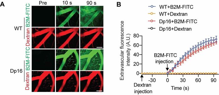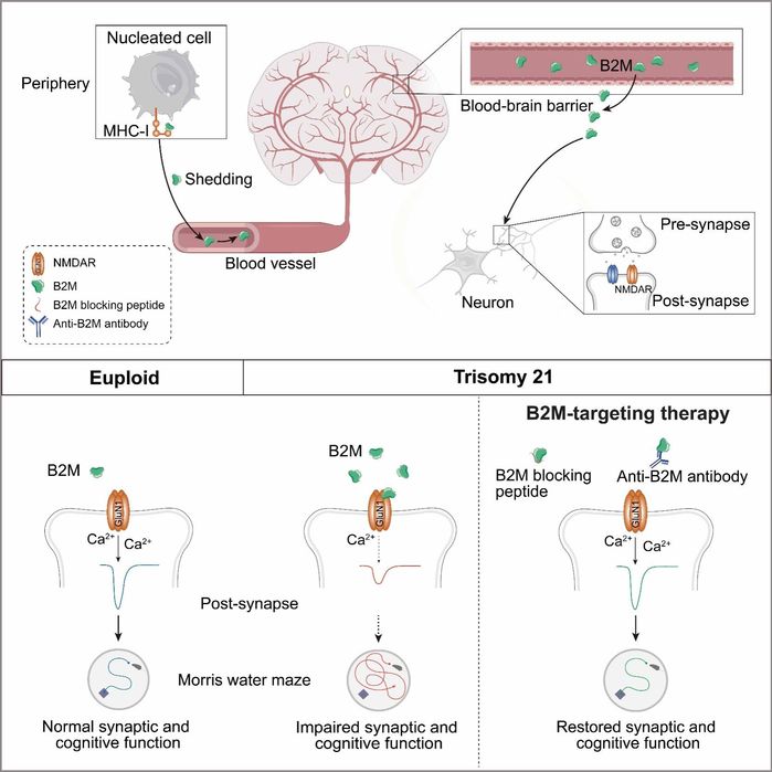 唐氏综合征(Down syndrome, DS),又称21-三体综合征,是先天性智力障碍的最常见原因。目前唐氏患儿出生率接近1/800,预计中国约有100万唐氏患者,给家庭和社会造成沉重负担。除了神经系统功能异常,唐氏患者表现出血液系统疾病高发的问题,如白血病和免疫力低下。王鑫教授团队首次发现了外周血参与唐氏综合征认知障碍,揭示了患者血液中增加的β2-微球蛋白(简称B2M)可以通过血脑屏障进入大脑导致认知损伤的新机制。团队进一步研究发现,通过抗体治疗减少外周血中的β2-微球蛋白水平成功地逆转了小鼠的认知障碍。