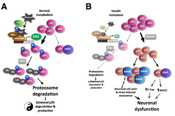 导致二型糖尿病的一个关键诱因是高糖诱导产生的机体对胰岛素的抵抗(Insulin Resistance-IR), 进而产生高胰岛素血症(Hyperinsulinemia),对机体产生很多损伤,其中也包括大脑。外周高胰岛素会通过主动运输的方式进入大脑;短期的胰岛素暴露对神经元的代谢具有支持作用,但长期的脑部高胰岛素也会导致大脑Hyperinsulinemia,并诱导神经元的胰岛素抵抗和增加AD的发生的风险。但脑部高胰岛素水平是如何诱导神经元损伤以及增加AD风险的机制还有待阐明。该研究发现外周的高胰岛血症会导致大脑中的胰岛素水平升高导致神经元的胰岛素抵抗,进而会降低葡萄糖代谢的关键酶己糖激酶2(Hexokinase 2),从而导致神经元中糖酵解紊乱。同时HK2会调控细胞周期蛋白激酶CDK5的激活蛋白P35的累计,并诱导糖原合成酶GSK3beta的异常激活,导致beta-catenin的累计,从而激活神经元的细胞周期。神经元细胞周期的激活会导致神经元的衰老,衰老神经元表现出神经突触功能紊乱等损伤特征。