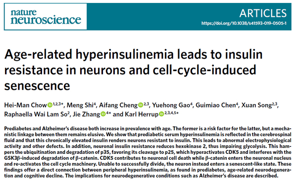 2019年10月22日,厦门大学神经科学研究所张杰教授课题组在国际神经科学顶级期刊《Nature Neuroscience》(IF=19.912)上合作发表题为“Age-related hyperinsulinemia leads to insulin resistance in neurons and cell-cycle-induced senescence”的研究论文,首次揭示了神经系统的胰岛素抵抗会通过诱导细胞周期重启导致神经元衰老的现象和机制,为T2D和AD的诊治提供了新的理论基础和靶点。