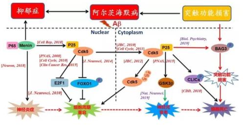 张杰教授课题组主要从事重大神经系统疾病(老年痴呆、抑郁症、自闭症、术后认知障碍)等的发病机制和药物开发研究。以CDK5为中心,系统探讨了抑郁和AD的关联机制,并阐明了一条神经炎症-细胞周期重启-神经元衰老-细胞死亡的调控通路(如下图)。相关成果张杰教授作为通讯作者发表在在国际知名期刊Nature Neuroscience, Neuron,Cell Reports, PNAS, Biological Psychiartry, The Journal of Neuroscience, Clinical Cancer Research等杂志上。