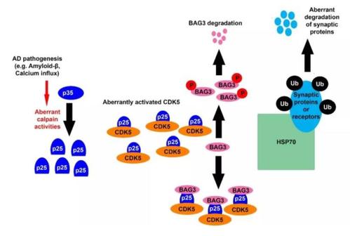 在分子机制上,研究团队发现BAG3可以结合HSP70稳定神经元突触相关蛋白,CDK5激活导致BAG3的降解会扰乱这一过程,从而加剧了AD致病过程中神经元功能的损害(如下图)。该研究发现了一条在AD致病早期调控神经元突触功能的新通路和新靶点,为AD的防治奠定了基础。