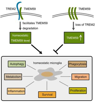 TREM2通过TMEM59稳态维持小胶质细胞生理活动的示意图