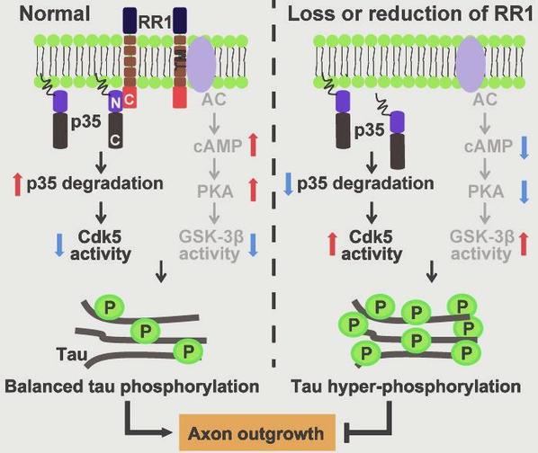 在此基础上,该团队最新发现RPS23RG1(RR1)的胞内羧基端区域能够与Cdk5激酶的激活蛋白p35的氨基端相互作用,介导p35的膜定位并影响其泛素化降解,从而调控在tau蛋白异常磷酸化过程中发挥重要作用的Cdk5激酶的活性(如图所示)。Rps23rg1基因敲除小鼠中p35蛋白及tau蛋白磷酸化水平升高,进而导致神经元轴突生长异常,而通过下调p35蛋白水平或抑制Cdk5活性都能改善Rps23rg1 KO小鼠神经元轴突异常及tau磷酸化水平。更重要的是,团队在tau蛋白病模型小鼠神经元中发现RPS23RG1蛋白水平显著下降而p35水平显著升高,并表现出神经元轴突生长异常,而通过恢复RPS23RG1蛋白水平可以降低tau蛋白病模型小鼠神经元中的p35水平及tau蛋白过度磷酸化,并逆转轴突生长缺陷。
