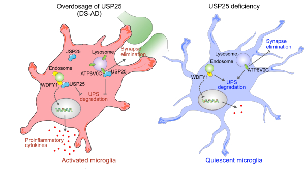 该研究中,王鑫教授团队构建了一个新的DS-AD杂交小鼠模型(5×FAD;Dp16),发现21号染色体三拷贝会加剧AD的关键病理特征—小胶质细胞激活和神经炎症反应,于是研究团队将注意力聚焦到21号染色体编码的免疫相关基因上。其中,泛素特异性蛋白酶USP25作为白细胞介素IL17介导的信号通路和炎症反应的负调控因子,在先天免疫过程中发挥重要调控作用。此外,USP25缺陷会抑制干扰素调控因子IRF3转录活性,从而减少I-型干扰素IFNs的产生,但USP25在中枢神经系统中的功能未见报道。研究团队发现USP25在唐氏患者和唐氏模型小鼠Dp16脑中表达水平均显著增加,且在小胶质细胞中高表达,提示其可能参与神经炎症的发生发展。