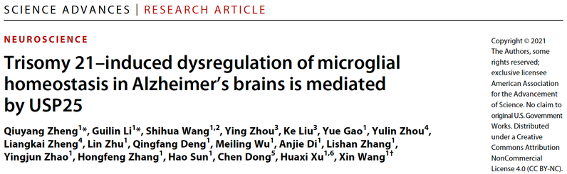 近日,厦门大学医学院神经科学研究所王鑫教授团队在Science Advances上发表题为“Trisomy 21-induced Dysregulation of Microglial Homeostasis in Alzheimer’s Brains is Mediated by USP25”的研究成果,该研究揭示了治疗阿尔茨海默病和唐氏综合征新的治疗靶点,并且在小鼠模型上利用USP25小分子抑制剂成功地改善了阿尔茨海默病小鼠的认知功能,缓解了神经退行性病变的病理进程。