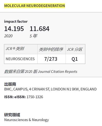 《Molecular Neurodegeneration》期刊于2006年创刊(http://www.molecularneurodegeneration.com/),主要发表关于各种神经退行性疾病的细胞与分子致病机理的研究论著和综述文章。期刊自创办以来受到国际性的关注,已成为神经科学领域的顶级期刊。