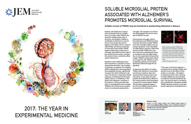 该论文阐述了新近发现的阿尔茨海默病(Alzheimer’ disease, AD)重要风险基因TREM2对疾病发生的全新作用机制,为治疗这一严重影响人类健康的神经退行疾病提供了新的方向。论文发表后就引起了国际学术界的广泛关注,众多学术网站都给予了很高的评价,也被F1000 Prime列为推荐文章。