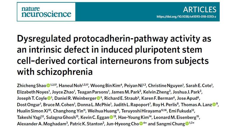 2019年1月21日,厦门大学神经科学研究所暨福建省神经退行性疾病及衰老研究重点实验室邵志成副教授课题组与哈佛大学,纽约医学院Sangmi Chung实验室等单位合作在《Nature Neuroscience》发表了题为“Dysregulated protocadherin-pathway activity as an intrinsic defect in induced pluripotent stem cell–derived cortical interneurons from subjects with schizophrenia”研究论文(https://doi.org/10.1038/s41593-018-0313-z)。该研究阐述了Protocadherin在中间神经元发育阶段的表达异常是导致精神分裂症发病的关键因素。