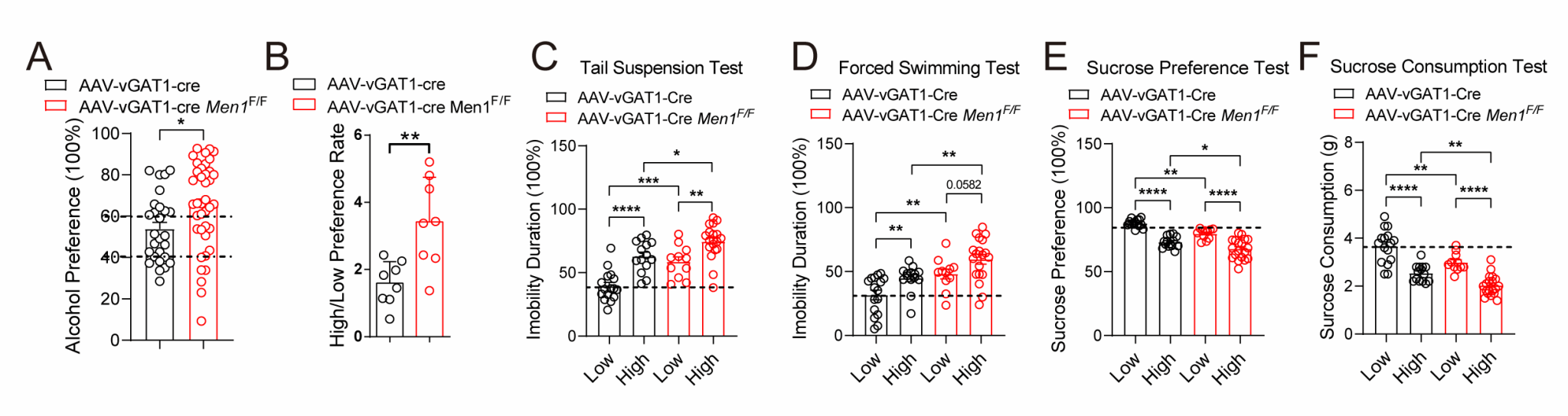 研究团队利用C57BL/6J小鼠的双瓶选择饮酒模型,模拟人类饮酒行为,发现高酒精偏好小鼠表现出明显的抑郁样行为。更令人关注的是,这些小鼠的杏仁核中Menin蛋白和mRNA水平显著下降,提示Menin可能与AUD共病抑郁症密切相关。
