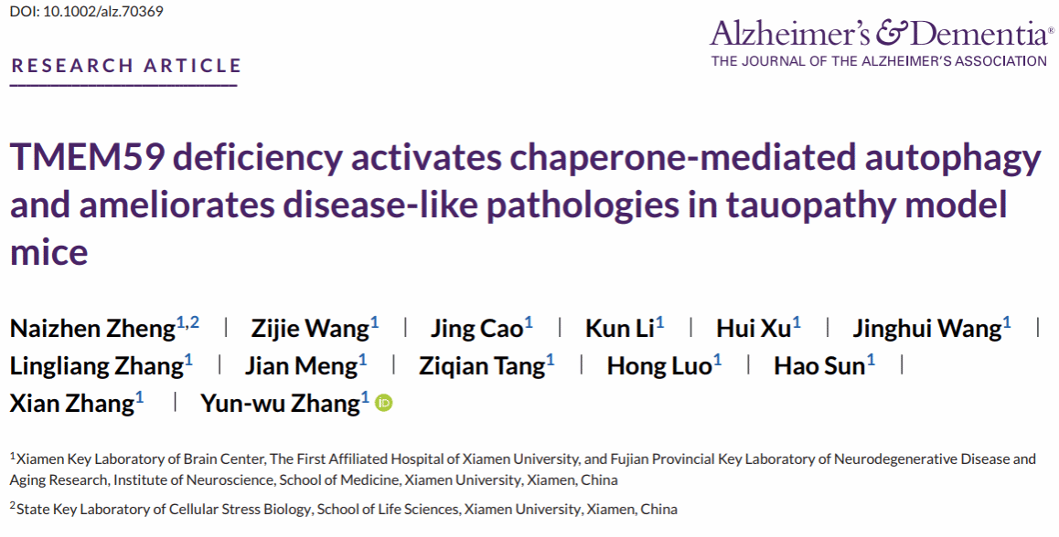 近日,厦门大学神经科学研究所张云武教授团队在国际权威期刊《Alzheimer’s & Dementia》(国际阿尔茨海默病协会官方杂志)上发表了题为“TMEM59 deficiency activates chaperone-mediated autophagy and ameliorates disease-like pathologies in tauopathy model mice”的研究论文。该研究揭示了自噬相关蛋白TMEM59在Tau疾病中的关键调控作用,为靶向TMEM59治疗Tau疾病提供了新策略。