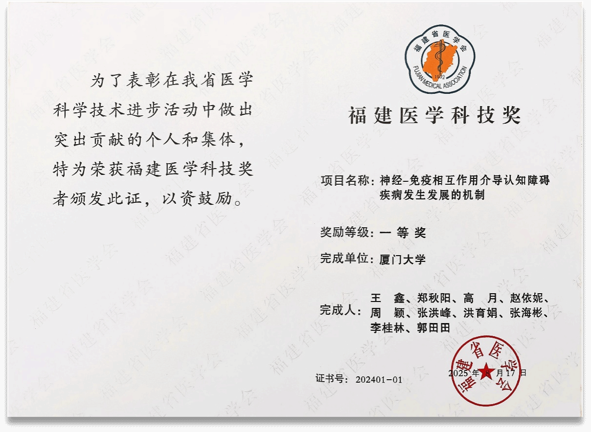 近日,厦门大学神经科学研究所王鑫教授团队项目“神经—免疫相互作用介导认知障碍疾病发生发展的机制”荣获2024年度福建医学科技奖一等奖。该成果系统揭示了外周免疫与中枢神经病理之间的关键联系,为认知障碍疾病的精准干预提供了重要理论依据与潜在靶点。
