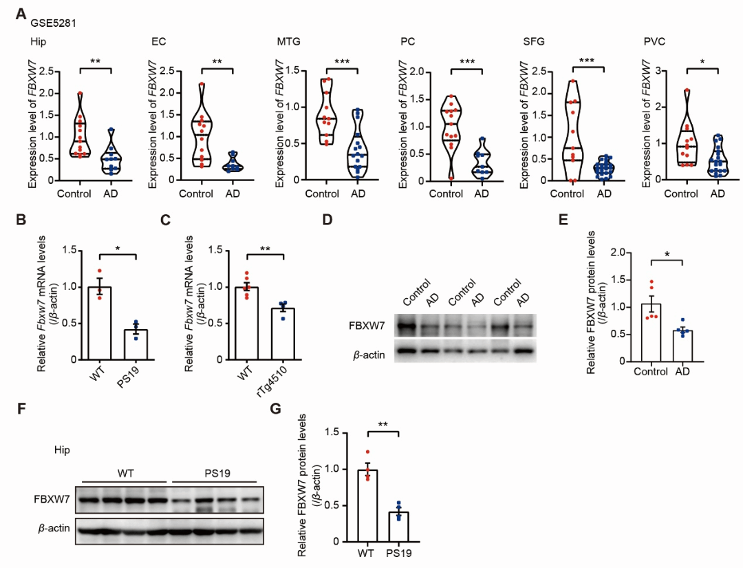 图2. FBXW7在AD和tau疾病模型小鼠表达降低