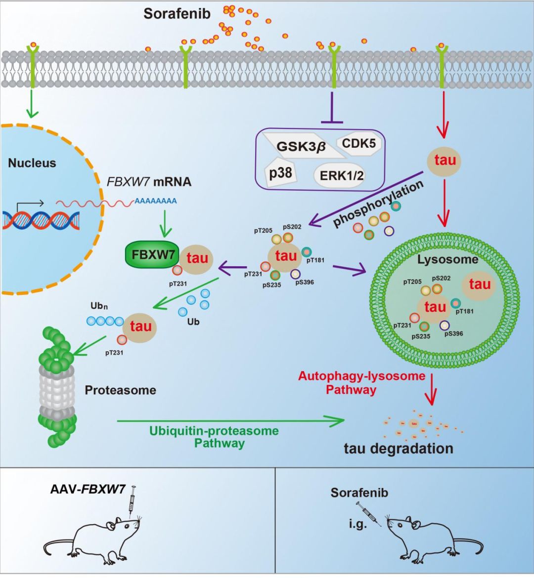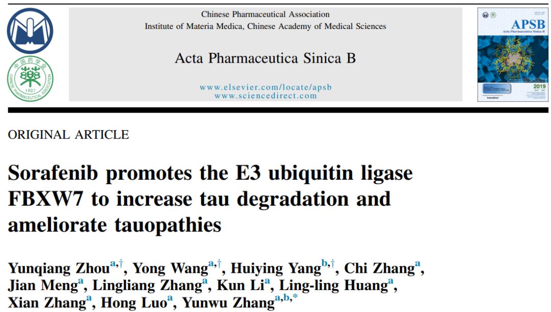 近日,厦门大学神经科学研究所张云武教授团队在Acta Pharmaceutica Sinica B(APSB)上发表了题为“Sorafenib promotes the E3 ubiquitin ligase FBXW7 to increase tau degradation and ameliorate tauopathies”的研究论文。该研究发现抗癌药索拉非尼能显著降低tau和磷酸化tau蛋白水平,改善tau疾病模型小鼠的认知障碍和病理特征。索拉非尼可通过上调E3泛素连接酶FBXW7,经泛素-蛋白酶体通路促进ptau231蛋白降解。此外,FBXW7在AD患者及tau疾病小鼠脑中表达下调,且恢复其表达可改善小鼠认知障碍和病理特征,也为tau疾病干预提供了一种新的策略。