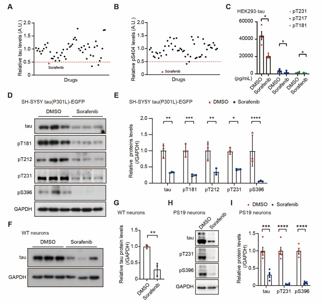 研究人员究采用“老药新用”的策略对美国食品药品监督管理局(FDA)批准的可穿过血脑屏障的小分子药物进行筛选,发现索拉非尼能有效降低总tau和磷酸化tau蛋白水平(图1)。索拉非尼灌胃给药可显著改善tau疾病模型小鼠(PS19)的认知缺陷和tau病理变化。考虑到索拉非尼作为多靶点蛋白激酶抑制剂,并且Tau蛋白的磷酸化修饰会受到多种蛋白激酶调控,研究人员进一步证实索拉非尼处理能够抑制负责tau磷酸化修饰的多种蛋白激酶,包括CDK5、ERK1/2、GSK3β以及p38。