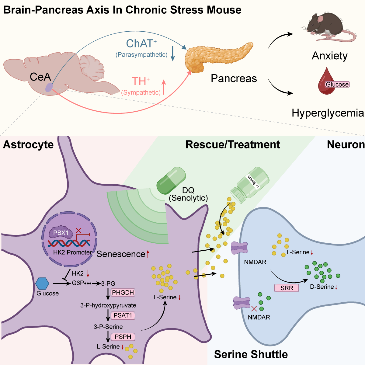 近日,厦门大学神经科学研究所张杰教授和冷历歌教授团队在国际知名杂志,Cell旗下子刊Cell Metabolism(IF:30.9)发表题为“Amygdala Astrocyte Senescence Drives Stress-Induced Anxiety and Hyperglycemia”研究论文,揭示了慢性压力应激通过诱导杏仁核星形胶质细胞衰老,破坏“星形胶质细胞-神经元丝氨酸穿梭”并进一步重塑胰腺交感/副交感神经支配,从而导致焦虑样行为和高血糖发生的机制。这一研究为理解应激压力与代谢异常共病提供了新的理论框架,也为相关疾病干预提供了新的潜在靶点。
