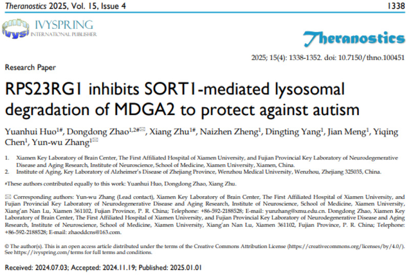 Yuanhui Huo, Dongdong Zhao, Xiang Zhu, Naizhen Zheng, Dingting Yang, Jian Meng, Yiqing Chen, Yun-wu Zhang. RPS23RG1 inhibits SORT1-mediated lysosomal degradation of MDGA2 to protect against autism. Theranostics. 2025; 15(4): 1338-1352.