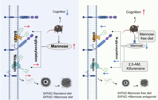 机制上,单细胞转录组学和代谢组学均提示,甘露糖可促进β-分泌酶1(BACE1)和Nicastrin的N-糖基化,从而提高其蛋白质稳定性,促进Aβ的产生。相反,减少甘露糖的摄入会降低BACE1和Nicastrin的稳定性,最终减少Aβ的产生并减轻AD病理特征。