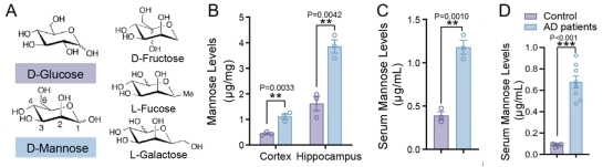 首先,为了系统的研究各种单糖在AD中的变化情况,张杰教授团队对AD小鼠脑组织和血清,以及AD患者血清中的单糖水平变化进行了检测,筛选到甘露糖的水平与阿尔茨海默病的病理特征密切相关。